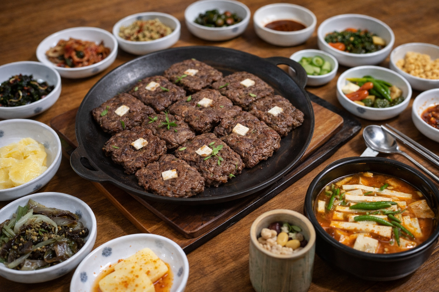 숯불에 구운 떡갈비와 한식 상차림이 정갈하게 나옵니다.
